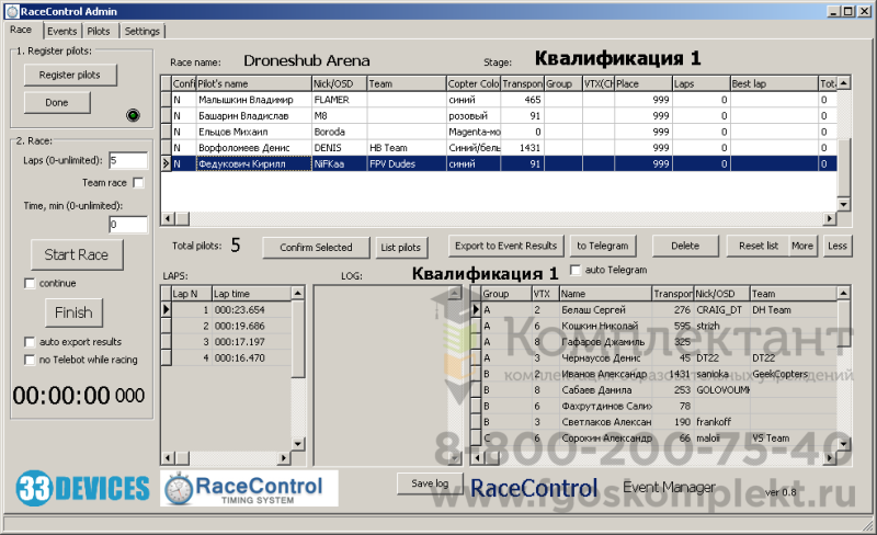 RaceControl позволяет максимально автоматизировать проведение соревнований, начиная от регистрации пилотов, разбивки по группам, проведения этапов и заканчивая выдачей результатов. Вся информация хранится в электронном виде в базе данных и может быть доступна в любой момент гонки как организаторам, так и пилотам.