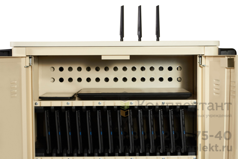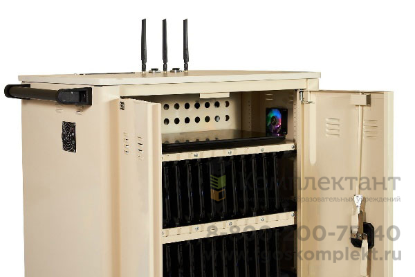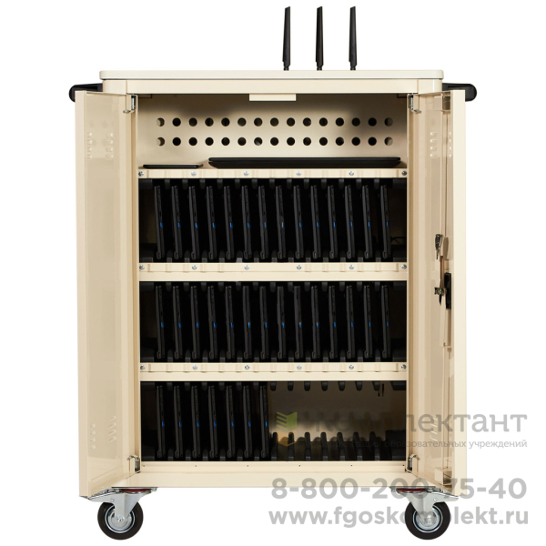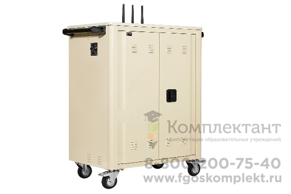 Внутри металлического корпуса мобильной тележки располагаются четыре полки с пластиковыми ложементами для размещения планшетов (ширина каждой ячейки составляет 25 мм). Полки регулируются по высоте в зависимости от габаритных размеров планшетов. Внутреннее отделение закрывается двумя дверьми с ригельным замком. Применение пластиковых ложементов с индивидуальными ячейками гарантирует правильное позиционирование планшетов и защиту корпусов устройств от износа и царапин при извлечении. В верхней части всех полок закреплен специальный кабель-канал для укладки и фиксации проводов зарядных устройств. Группы зарядных устройств, контроллер зарядки, встроенная беспроводная система и другое оборудование располагаются в техническом отсеке мобильной тележки.