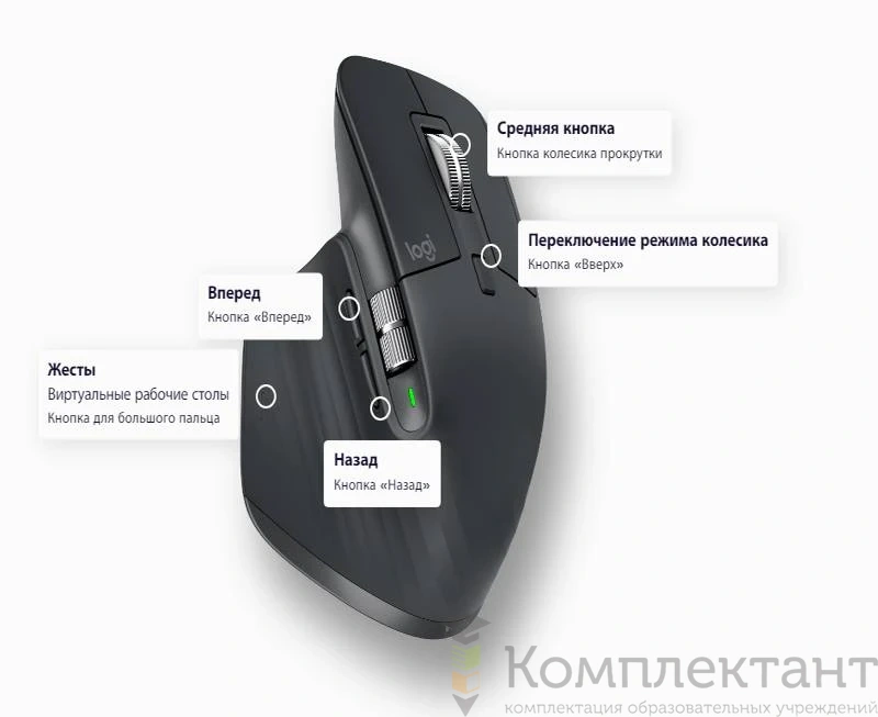 Под большим пальцем на корпусе Logitech MX Master 3s находятся две боковые клавиши с функцией программирования. Всего предусмотрено 7 кнопок. Среди них прорезиненное колесо прокрутки, основные, боковые клавиши, а также кнопки переключения между приложениями и смены DPI/CPI. За быстродействие и высокоточное позиционирование манипулятора отвечает светодиодный сенсор с поддержкой разрешения 8000 dpi. Показатель dpi можно изменять в зависимости от специфики выполняемых задач.