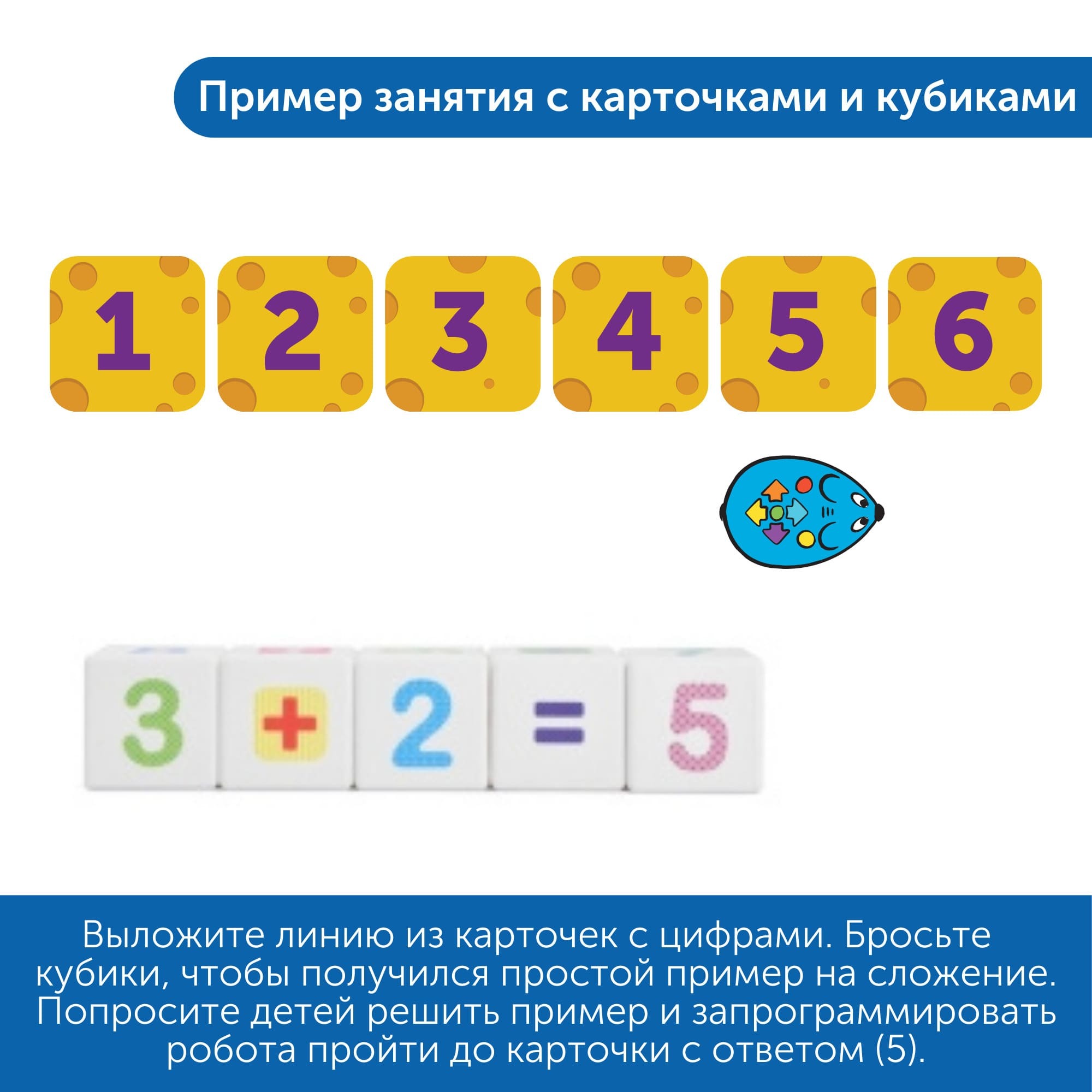 Используя двусторонние карточки, игральные кубики и математические коврики, дети познакомятся с основными принципами кодирования, сложением, вычитанием, последовательностью чисел. Малыши 4-5 лет могут изучать азы арифметики, сложение и вычитание, а дети постарше могут изучать умножение и деление, составлять примеры в несколько действий. Набор подходит как для самостоятельных, так и групповых занятий. Обратите внимание: робот продается отдельноВ набор входит: